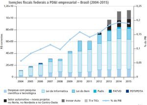 O total de isenções fiscais no ano de 2015 foi de R$ 11,3 bilhões, pouco mais de um terço do total de apoio do governo federal em PD&I, R$ 32 bilhões também em 2015. Considerando que apenas uma pequena parte desse total de apoio é destinado às atividades de PD&I nas empresas, as isenções fiscais que totalizaram R$ 11,3 bilhões tornam-se ainda mais relevantes.